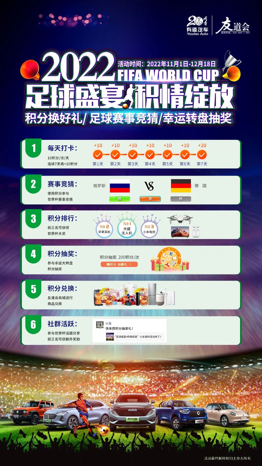 2022年11月20日-12月18日期間,到有道品牌門(mén)店試駕或保養(yǎng)愛(ài)車,即可參與“足球盛宴?積情綻放”小友福利活動(dòng)。