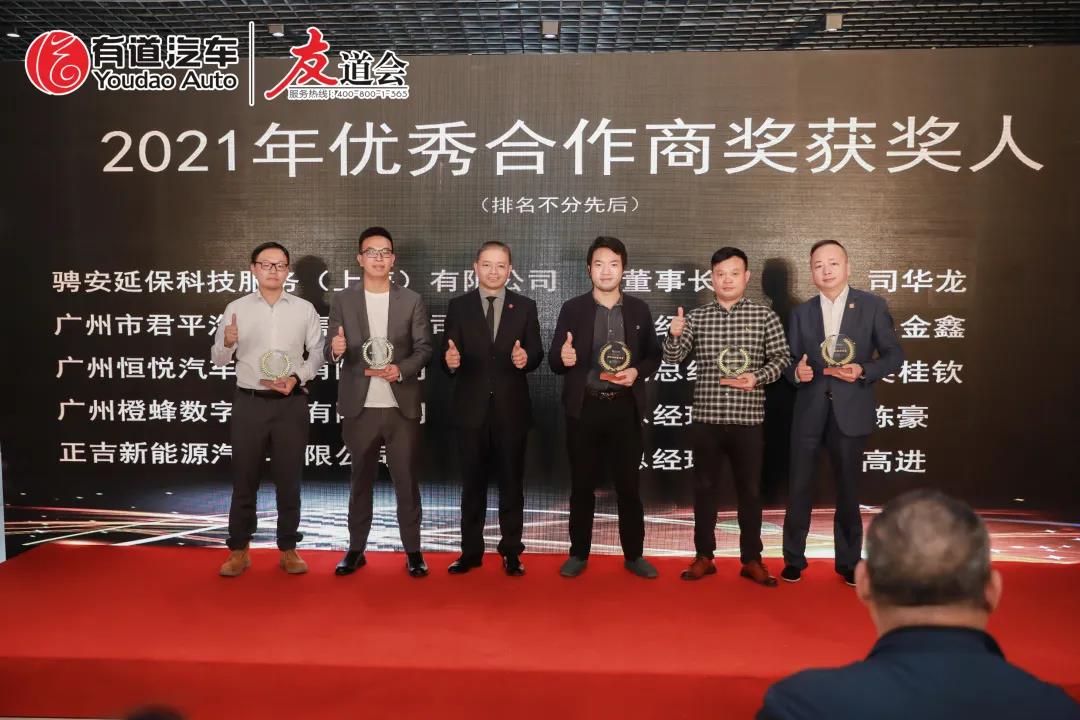 有道汽車集團(tuán)林大昌林董上臺為各位優(yōu)秀合作商頒獎(jiǎng),與2021年優(yōu)秀合作商獎(jiǎng)獲獎(jiǎng)嘉賓合影留念。