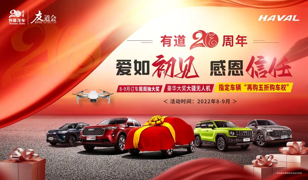 周年慶期間到店訂車尊享有道8-9月“20周年買車周周抽獎”有機(jī)會獲得無憂保險、精美禮品、汽車精品、家用電器、多臺大疆無人機(jī)、指定車輛再購5折購車權(quán)等。